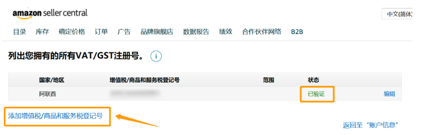 卖家平台>设置>税务设置>添加增值税/商品和服务税登记号